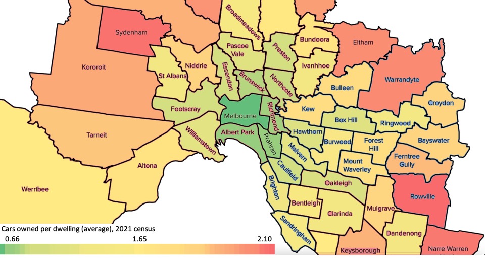 Middle- and outer-suburban Melbourne are built for the motor car. Household car ownership rates in these areas are very high.
