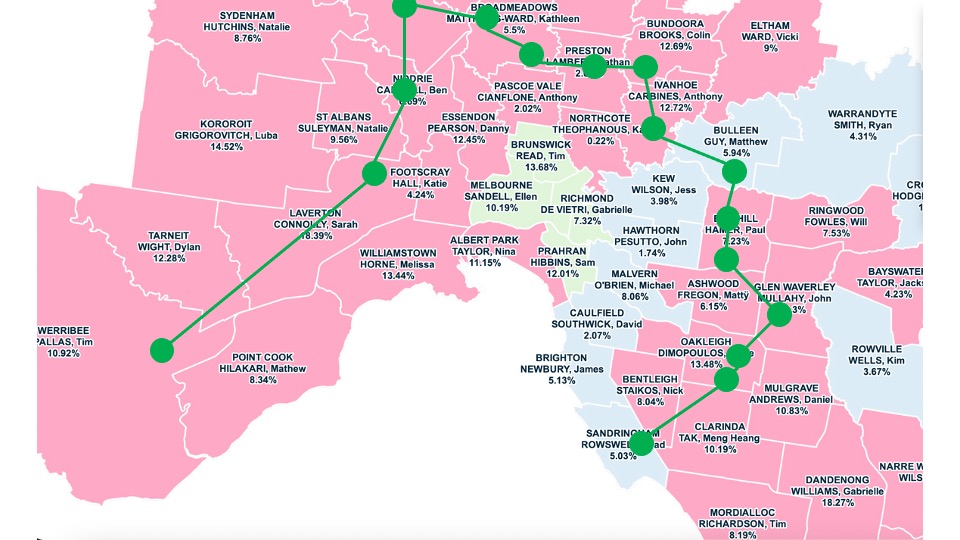 Suburban Rail Loop route with state electoral districts and the winning margin of the elected member